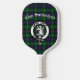 Pickleball paddle features Clan Sutherland Modern Tartan background with clan crest badge and customizable text overlay