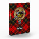 Clan Wallace crest badge surrounded by a strap and buckle over tartan background. Custom text.