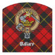 Clan Wallace crest badge surrounded by a strap and buckle over tartan background. Custom text.