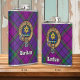 Clan Wardlaw crest badge surrounded by a strap and buckle over tartan. Custom text.