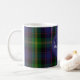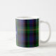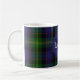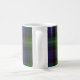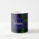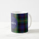 Monogrammed coffee mug done in a traditional and colorful Scottish clan Watson tartan plaid pattern. A blue circle has a monogram and family name. Personalize the monogram and name to suit your needs.