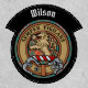 Clan Wilson crest badge surrounded by a strap and buckle over ancient tartan. Custom text.