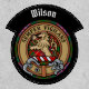 Clan Wilson crest badge surrounded by a strap and buckle over modern tartan. Custom text.