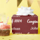 This dark red wrapping paper has a text template you can edit. You can change the white text to show your graduate's name, the year the student is graduating (shown: Class of 2024), and a custom message (shown: Congratulations). Congratulations and Class of 2024 are in an elegant script, but the graduate's name is not in a script.