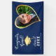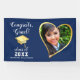 This elegant light navy blue, gold and white graduation banner for the class of 2025 graduate features a heart-shaped photo, a "Congrats, Grad!" saying, and a graduate's cap illustration. Please personalize with the graduate's name, upload a custom photo via template, and change a year before ordering.