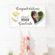 Create a unique white, black and golden yellow graduation banner for the class of 2025 graduate with a heart-shaped photo, Congratulations saying, and grad's cap and diploma illustrations. Please personalize with the graduate's name and surname, upload a custom photo via template, and change a year before ordering.