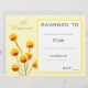 A stylish modern class art award certificate award with cute yellow Billy Button native Australian flower floral watercolor yellow image perfect for encouraging a young art student. You can write in your own details. A great resource for any type of classroom teacher.