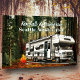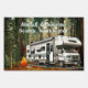 Double-sided campsite sign for RV campers. The design is a forest background, campfire and a Class C, drivable motorhome. Wording is white with a green shadow and two lines of text. Include names and hometown location, or any other wording you prefer. The design and text will be printed on both sides of 12 x 18 inch sign (or choose the larger size) with optional wire stand.