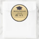 Elegant modern black and gold graduation sticker template. Black graduation hat illustration orange accent over gold tones circle.