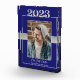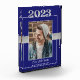 A blue and silver Class of 2023 graduation photo keepsake that you can personalize as a memento for the twenty, twenty-three graduate. The front is a classic blue with a fine white line surrounding the portrait of the graduating student. You can easily replace the sample photo with your own using the template area.