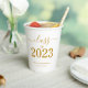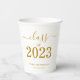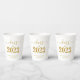 Stylish elegant custom graduation party supply! Celebrate the graduate's accomplishment in style with this trendy graduation party paper cups. Design features "Class of 2023" in gold font on a clean white background. Personalize this product by adding the name and school name. Easy to customize. Matching graduation party supplies available. Congratulations!