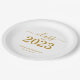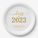 Stylish elegant custom graduation party supply! Celebrate the graduate's accomplishment in style with this trendy graduation paper plates. Design features "Class of 2023" in gold font on a clean white background. Personalize this product by adding the name and school name. Easy to customize. Matching graduation party supplies available. Congratulations!