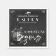 Class of 2025 Adventure Begins Graduation Party Napkins .The design has an inspirational quote NEW ADVENTURE BEGINS written in a pretty typography style with space to add class of 2025 graduate's name and the school name on a black background . Customize these simple elegant paper Napkins for the graduation party by changing the name of the 2025 grad and name of the school . For any further customization , feel free to contact me at mypaperlove2021@gmail.com
