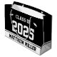 This black and white gift bag says Class of 2025 in large white text. (You can change the year if you need to.) At the bottom, there's black text you can change to show the correct name for the graduate. White graduate's caps are on either side of the phrase "Class Of".