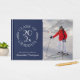 Create a wonderful keepsake for your graduate with a classic graduation guestbook featuring their name, photo, graduation year, and school. Customize the year for a chic, white on navy blue typography emblem which reads: CLASS OF [YEAR] GRADUATE with the words curving around the year in the middle with curved botanical leaves along each side of the circular design. Add your grad's photo, name, high school or college name, graduation date, and text for a unique gift.