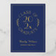 Send elegant blue and gold graduation invitations for your graduate's celebration featuring a chic gold foil typography emblem which reads: CLASS OF [YEAR] GRADUATE with the words curving around the year in the middle with curved botanical leaves along each side of the circular design. Below the emblem is the graduate's name in a gold foil script font and their school in a sleek serif font. A fine gold foil rectangle creates a border near the edge.