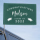 Celebrate your graduate's milestone in style with this personalized Class of 2025 graduation car flag, featuring the grad's first name in trendy white handwritten script, between the words "Congratulations" and "Class of 2025" in white sans serif text on a dark green background, decorated by a pair of white mortar board caps.