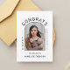Elegant black and white congrats typography script graduation announcement card with a trendy arch shape photo and modern look.