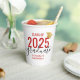 Personalized Red Graduation Party Paper Cups for the Class of 2025 featuring the graduate's name and class year with bold modern and fun typography overlay and an elegant script font with a gold graduation hat accent.