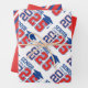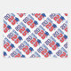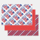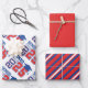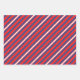 This image showcases a set of three wrapping paper sheets designed for celebrating the graduation of the Class of 2025. The top sheet features a repeating pattern of the text "SENIOR Class of 25" in bold red and blue letters, accompanied by blue graduation caps and diplomas on a white background. The middle sheet is a solid red color, providing a vibrant and bold option. The bottom sheet displays diagonal stripes in red, white, and blue, creating a dynamic and festive look. This set is perfect for wrapping gifts for graduates, adding a celebratory touch to any present.