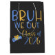 Bold text in blue and yellow reads "BRUH WE OUT" above a smaller text "Class of 2026," accompanied by a rolled diploma with a bow. The design has a playful and celebratory tone aimed at graduates. Whether from elementary school, middle school,high school or college….graduation is a a time to celebrate. And as Gen Alpha is known to say, “Bruh, we out!