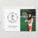 Send out classic graduation announcements featuring 2 grad photos. On the front, your photo is on the right and a chic black on white typography emblem which reads: CLASS OF [YEAR] GRADUATE is on the left with your graduate's name and school below it. The words curve around the year in the middle with curved botanical leaves along each side of the circular design. A second photo fills the whole back of the card.