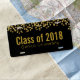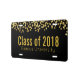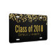 A personalized license plate which says Class of 20xx (customize with your year) and the graduate's school. Fake gold glitter confetti sprinkled across the top and set on a black background. Gold lettering.