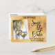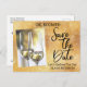 The left side of this "Save The Date" class reunion announcement design features champagne flutes and golden bokeh background. The right side and the back of the announcement hold the template information. Personalize the template information on the front and back, remove text and/or click customize to select a font color, size, and style you prefer.