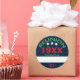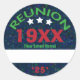 Customize this Class Reunion name tag sticker with your graduation year, reunion number, and school name, then write in each attendee's name at the event in the empty white box below the school name. Blue shiny background with colorful text. Edit all text.