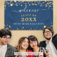 Create a class reunion welcome banner sign featuring the title WELCOME in a modern handwritten script typography, class of year and name of your school, college or university or other custom text accented with gold stars and string lights against an editable blue background you can change to your school color. CHANGES: Change the background color or any text font style, size, color, spacing and placement in EDIT. BANNER OPTIONS: The sample is shown in the 3x5' size; other sizes are available on the ordering page as well as the option of transferring the design to a foam board, poster, tapestry or other product or have the designer convert it to a DIGITAL DOWNLOAD file for printing locally BEFORE ordering. ASSISTANCE: For help with design modification/personalization, color change, resizing, transferring the design to another product or if you would like coordinating items, contact the designer BEFORE ORDERING via Zazzle Chat or makeitaboutyoustore@gmail.com.