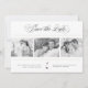 An elegant minimalist wedding save the date announcement card design featuring the couple's monogram on the top, 3 photos and classic typography in a simple layout.