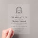 This classic, elegant graduation party invitation design features a black monogram initial in open serif font encircled by a line art acanthus crest on a clear background. Personalize the text with the graduate's name and the party details. Ideal for a high school, college or university graduate.
