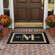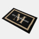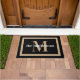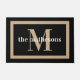 Simple and elegant custom doormat features your family name and monogram in classic lettering on a black background framed by a thick tan border.