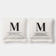 Classic and modern personalized cornhole bag set features an elegant custom serif monogram initial along with your family's last name accented with simple horizontal stripes. Black and white text and bag colors can be customized.