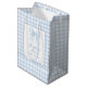 Classic preppy baby boy shower thank you favor gift bags featuring cute baby blue bow ribbon surrounded by light blue gingham pattern.