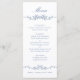 Elegant blue floral border wedding menu with a floral crest and monograms on the back.