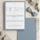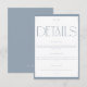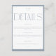 Share all the important wedding day information with your guests using this elegant and minimalist wedding details card. This design features a sophisticated blue color palette and clean typography, perfect for a modern and timeless celebration. It includes sections for reception details, accommodation information, and a space for your wedding website. The simple yet refined aesthetic ensures your guests have all the necessary details at a glance, making their planning seamless.