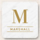 An elegant beverage coaster featuring a warm brass gold serif initial and custom family name monogram with horizontal rules on a white marble stone background. The luminous gold against creamy marble creates a luxurious, elevated accent for entertaining. A beautiful personalized gift for weddings, anniversaries, or housewarmings. All text is fully customizable.