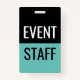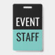 Classic event staff ID badges in simple budget friendly design in black and teal printed on both sides for corporate events, concerts, or seminars available in large quantities in bulk on or small quantities for smaller events.