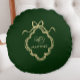 Beautiful and classic forest green Christmas holiday pillow features an elegant gold color crest with bow design and your custom name with traditional calligraphy script.