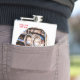 Classic American car of 1950th. Partial view of headlights, the front wheel, and a bumper. Funny hip flask.