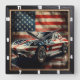 This wall clock features an iconic classic car, vibrantly adorned with a patriotic American flag design. Its vintage aesthetic and detailed automotive art make it a unique timepiece for car enthusiasts and collectors. Perfect for living rooms or offices, this retro clock celebrates national pride and American automotive heritage, adding a stylish and timeless statement.