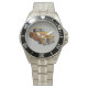 Has heft and feel of expensive stainless steel quartz watches. Good band with safety catch. I removed links, which is easy because engraved arrows show direction to push the linking pins. As always by this seller, the image (a railroad logo) is a perfect reproduction of my emailed image, and is precisely spaced and aligned.
