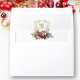 Timeless and elegant yet festive holiday-themed wedding envelope liner design featuring classic hand-drawn gold floral crest accented by a colorful spray of red and white Christmas flowers and evergreens. This custom formal template includes editable text fields