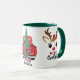 Celebrate Christmas with this charming ceramic mug featuring a cozy holiday design! With a green interior and handle, the mug showcases a classic red pickup truck from a rear view, carrying a Christmas tree in the back. Below the truck is the festive message, “Merry Christmas.” On each side of the mug, a cute reindeer face appears, showing off big eyes with lashes, antlers, and a bright red nose. The phrase “Merry Christmas” is also printed beneath each reindeer. Perfect for holiday beverages, this mug is a delightful way to bring Christmas cheer to your mornings!