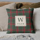 Custom-designed family name monogram throw pillow for the holiday season featuring classic style forest green and red Christmas plaid with personalized initial and name.