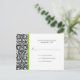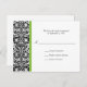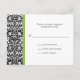 A black-and-white damask wallpaper pattern with lime green accents highlight this classic response card. Easily personalized with your own information. Make sure to change your return address on the back. Available in alternate colors with matching save-the-date cards, invitations, reception cards and favors.