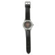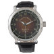 This watch is has a classic dark brown face. It says "Classic Time Keeping"