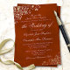 This beautiful foil wedding invitation features a classic style with lace filigree and fancy script lettering on a marbled rust orange or burnt umber colored background. The wording is formal and traditional, with the invitation being issued by the parents of the bride. Elegant and stylish, this invitation will add class and grace to your wedding celebration.