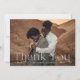 Elegant wedding thank you cards featuring your full-bleed horizontal wedding photo with "Thank You" in white lettering. Personalize the modern photo thank you card with your name. The back of the photo wedding thank you card displays your custom message in white lettering with a solid dusty blue background.